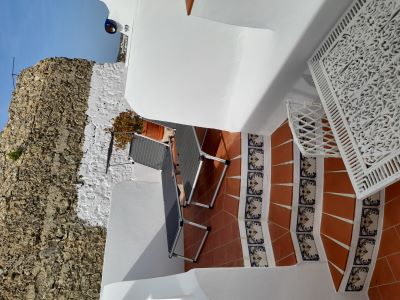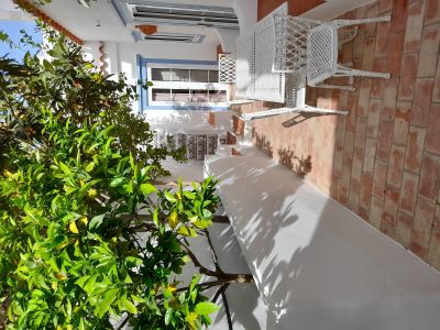 Im Patio gibt es insgesammt 3 von den weißen Tischen, die man zu einer langen Tafel zusammen stellen kann... über die Treppe gelangt man zu den oberen Terrassen...